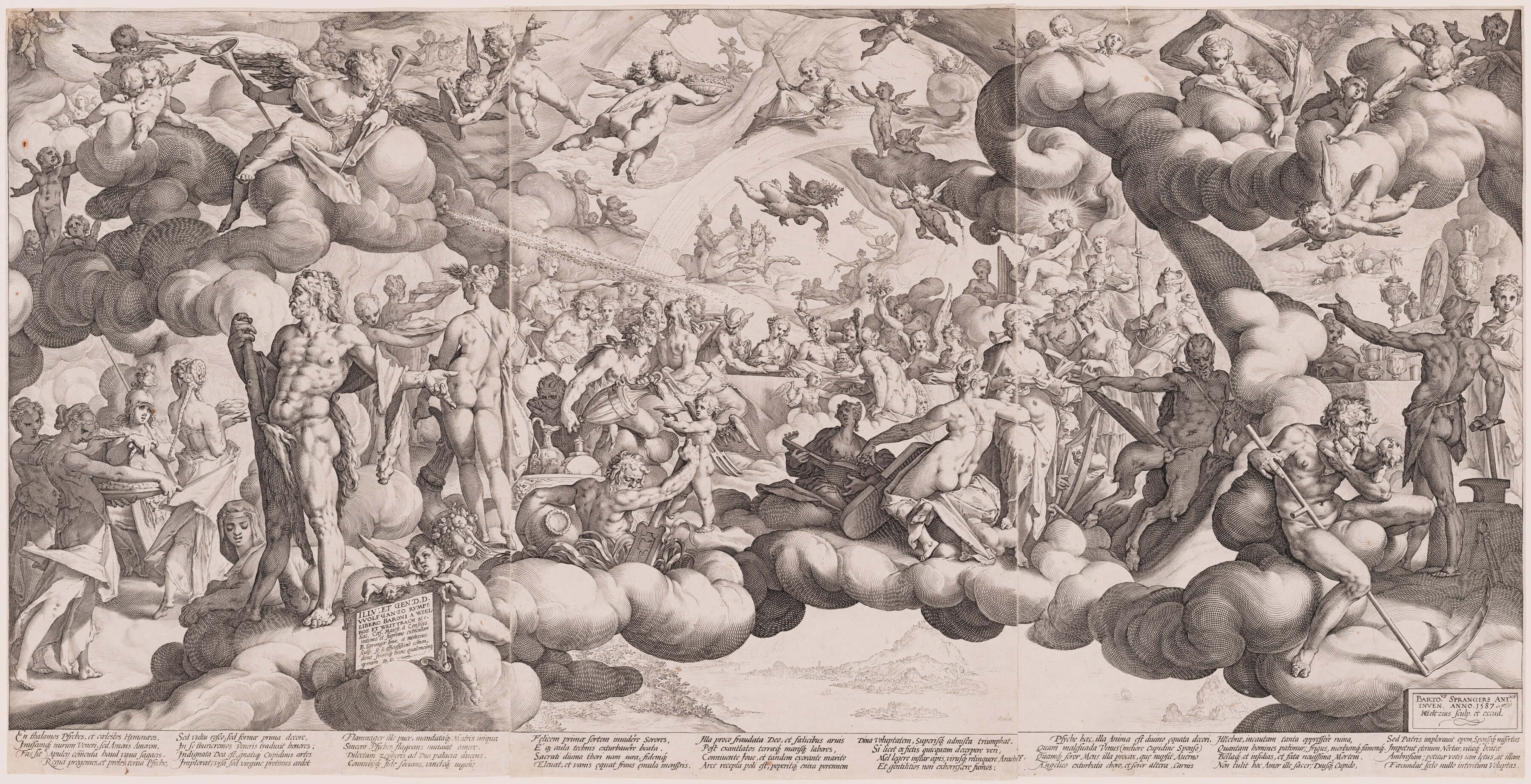 The majority of the works reflect the period of Italian, Dutch, and Netherlandish printmaking at its most virtuosic and sophisticated, from the 1520s to about 1650. A highlight of the gift and exhibition is Hendrick Goltzius’s tour de force, The Wedding of Cupid and Psyche (1587). One of the largest 16th-century engravings ever made, the work was printed using three separate plates on three sheets of paper. The composition depicts the culmination of the romantic myth of love between Cupid and Psyche and contains nearly 80 figures in a virtuosic display of technique. It was the largest and most famous of Goltzius’s collaborations with Bartholomeus Spranger, court painter to Emperor Rudolf II in Prague. Considered to be one of the most technically brilliant prints of the age, and one of the greatest examples of Goltzius’s technique, it fills a major gap in the MFA’s holdings of the artist’s work.