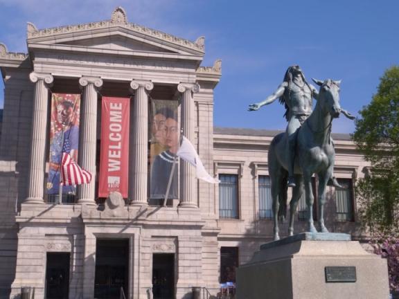 In 1912, when the MFA installed Cyrus Dallin’s Appeal to the Great Spirit at its Huntington Avenue Entrance, the sculpture was a contemporary work of art. The Museum’s leaders at that time did not intend for it to remain in front of the building permanently but it has stood there ever since. Depicting a Native American man astride a horse with his arms outstretched, Appeal to the Great Spirit has become an icon of the MFA and one of the most reproduced objects in the collection. A part of the Museum’s history, it has entered today’s international debates about cultural appropriation, public monuments, and Indigenous erasure.
