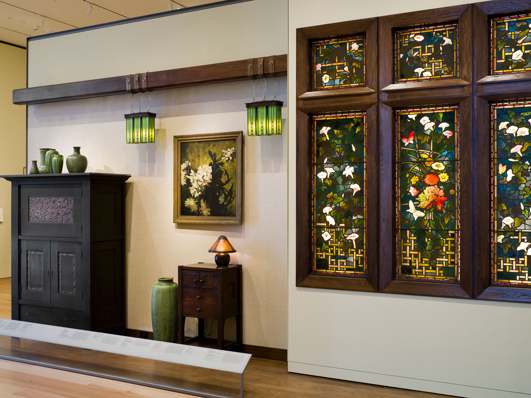 The Arts and Crafts in America gallery features paintings, furniture, architectural elements, ceramics, metalwork, and jewelry made in the early 20th century by artists and factories affiliated with the movement, including Frank Lloyd Wright, Charles Rohlfs, and the Grueby Faience Company. As the movement spread across the globe, Arts and Crafts found a ready audience in Boston’s intellectual and artisanal circles, including a particularly vibrant community of metalworkers and jewelry makers. The metalwork displays in this gallery complement and expand upon the exhibition “Boston Made: Arts and Crafts Jewelry and Metalwork,” on view in the Kaplan Family Foundation Gallery, 104, from November 17, 2018, to March 29, 2020.