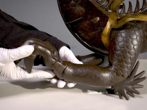Takaishi Shigeyoshi, articulated model of a dragon, second half of the 19th century. Forged and chiseled iron with gilding, copper (tongue), and shakudō (pupils). Gift of Mrs. W. Donnison Hodges.