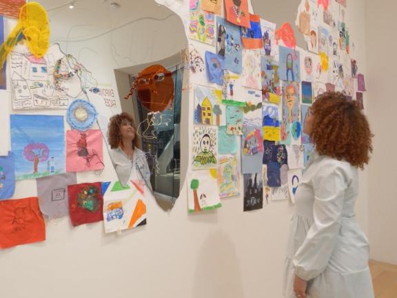 Works from the Museum’s collection by Faith Ringgold, Ekua Holmes, and others complement the students’ self-portraits by demonstrating how personal narrative and introspection result in unique, multilayered works of art. The young artists studied these works as a key part of the learning process, empowering them to create their own personalized representations. The cumulative mural includes mirrored acrylic, encouraging visitors to see themselves as a welcome part of the narrative.