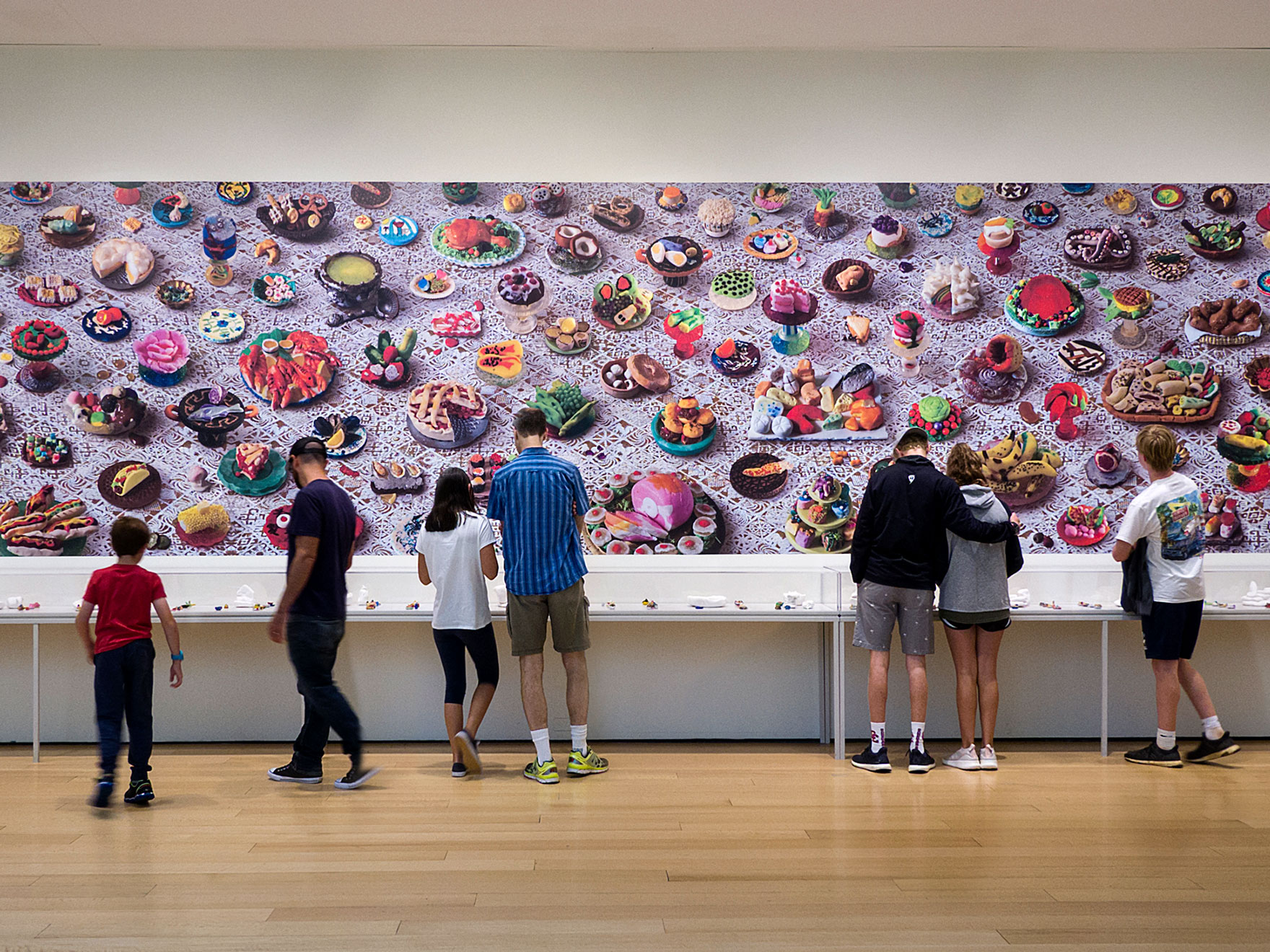 As a counterpoint to the immense photomural, each child made a small sculpture of a meal that he or she had eaten the day before, some of which have been enlarged to life scale by Weppler.
