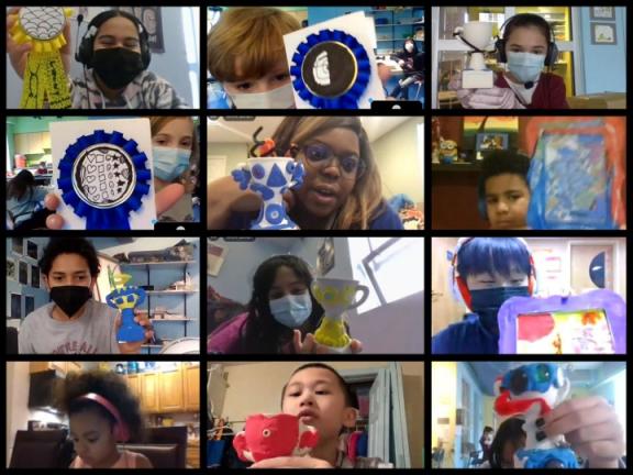 In addition to sharing behind-the-scenes images of her own work in her studio, Thervil highlighted ways that contemporary artists like Sammy Chong, Keith Haring, Simone Leigh, Wendy Red Star, and Rob Stull create patterns in their practice, process, and finished pieces. A goal for this project was to enable young artists to translate their ideas across mediums and learn techniques that highlight the unique properties of different materials. First, they explored visual rhythms by adorning ribbons with patterns inspired by their favorite music. Next, they created collages based on their favorite season to explore the relationship of patterns to layers. Finally, they studied the patterns’ relationship to texture by sculpting trophies for people who are important to them. Thervil designed a Bauhaus-inspired mural as a backdrop for their creations, to align with the theme of uniting simple patterns to create powerful visuals.