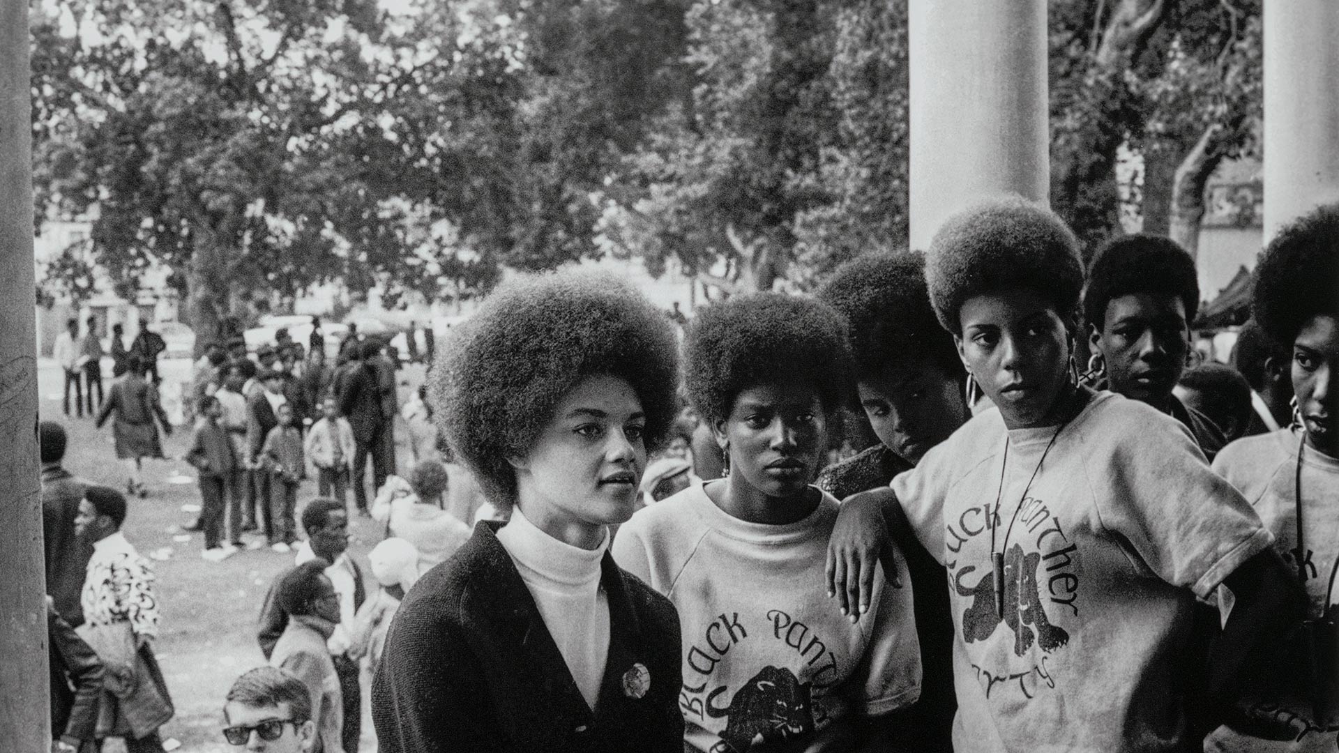 Stephen Shames, Oakland, California: Kathleen Cleaver, Communications Secretary and first female member of the Party’s decision-making Central Committee, talks with Black Panthers from Los Angeles who came to the “Free Huey” rally in DeFremery Park (named by the Panthers Bobby Hutton Park) in West Oakland (detail), 1968. Archival pigment print. Gift of Lizbeth and George Krupp. © 2023, Stephen Shames.