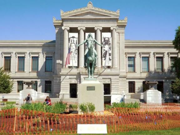 James-Perry’s installation, Raven Reshapes Boston: A Native Corn Garden at the MFA, draws on planting techniques used by local Indigenous people for thousands of years, centering the reciprocal relationship between humans and the land. The artist and her collaborators from Green City Growers will create a field of corn, beans, and sedges—grown in mounds using a traditional Woodlands Native American method—in the shape of a horseshoe crab and framed by crushed shells. Over time, tall corn stalks will surround Appeal to the Great Spirit—made by a white artist for white audiences—emphasizing the enduring Native presence in New England and serving as a counterproposal to the misrepresentations and erasures the sculpture embodies.
