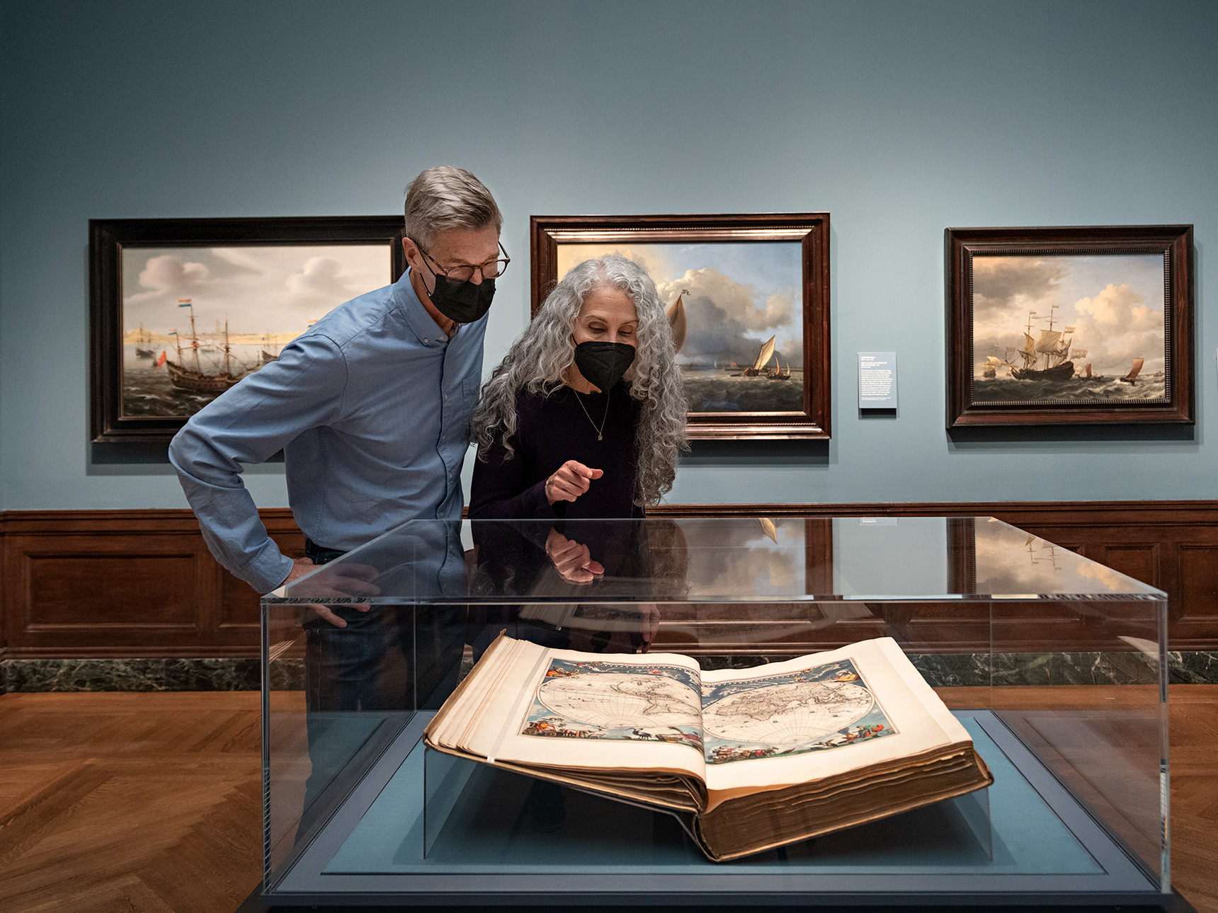 This gallery features a range of works that evoke Dutch trade networks stretching from the North Sea to the Indian Ocean and the Sea of Japan. Paintings include seascapes by Willem van de Velde the Younger and Ludolf Bakhuizen, as well as still lifes depicting a variety of local and imported commodities, including precious glassware produced in Antwerp and blue-and-white porcelain from China. Three volumes of Joan Blaeu’s Atlas maior illustrate cartography’s connection to capitalism.