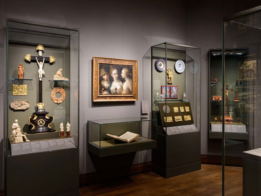 The term Kunstkammer refers to a collector’s cabinet, or small room, that came into fashion with royalty and nobility across Europe in the 17th century. These princely “art-rooms” typically contained a variety of both man-made and natural wonders. Conceived as microcosms of the world, they were intended to impress visitors with the owner’s command of art and nature—and collecting prowess. The MFA’s Kunstkammer features objects made of exotic materials such as amber and ivory; nautilus and coconut shells; paintings on copper and hardstone; and virtuoso metalwork, such as clocks and automata (self-operating machines). The gallery includes interactives for two intricate Kunstkammer treasures. iPads placed just below the Diana and Stag Automaton and the Covered Cup (Globuspokal) allow visitors to view videos of the objects in action or engage in close looking at the rich detail on the figures. Watch the video of the Diana and Stag Automaton: the automaton moves, zig-zagging across a table, with the help of German watchmaker Rolf Lang, who re-created its original motor. See the interior of the Covered Cup (Globuspokal) revealed in this short video.