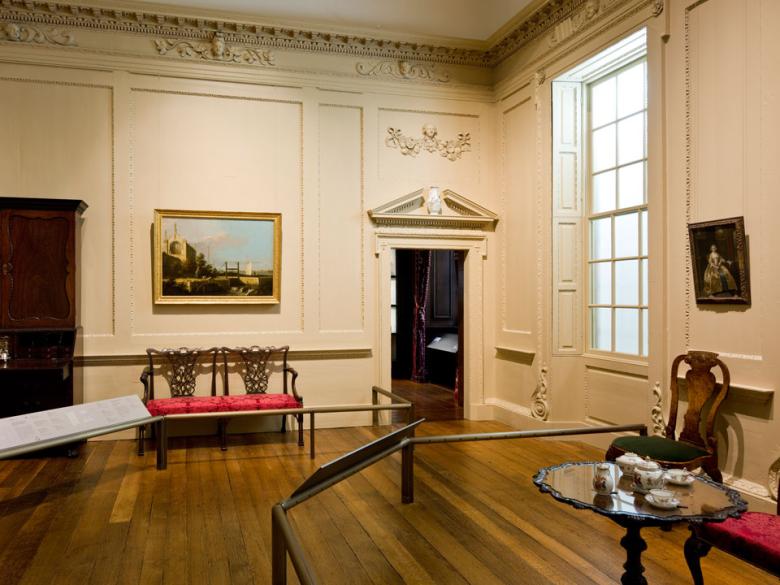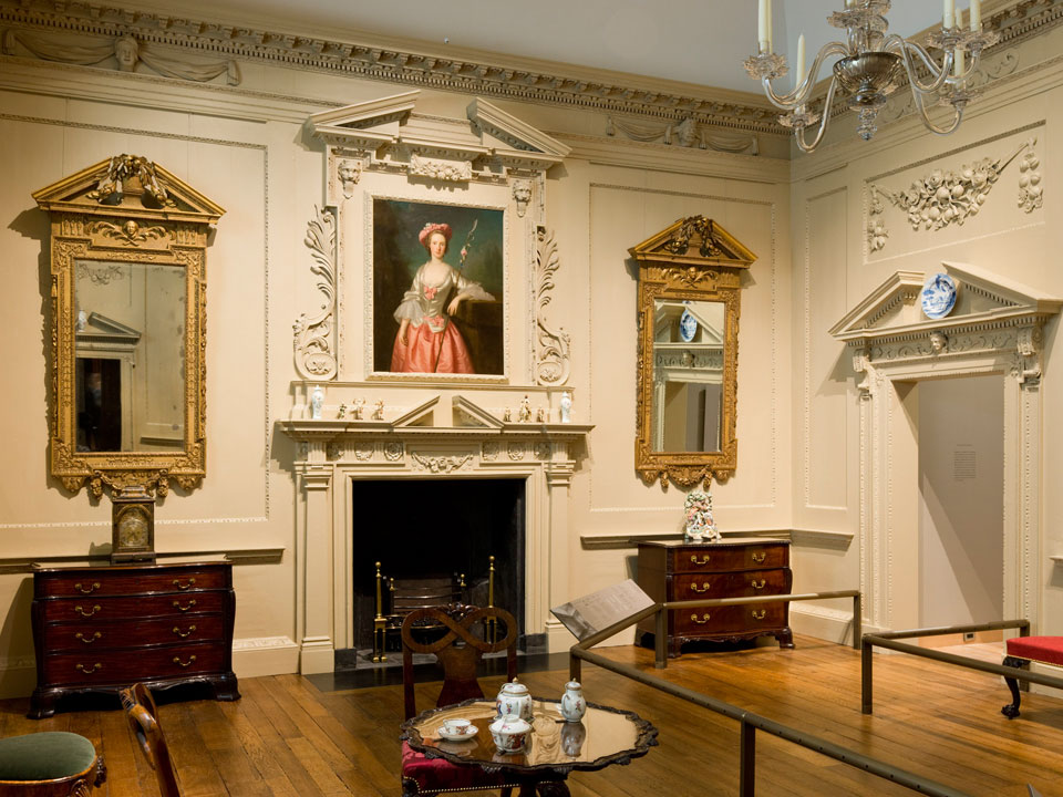 This grand drawing room, whose cast-iron fireback is dated 1748, comes from Newland House, a 17th-century manor house in Gloucestershire, England. The MFA installed it as a period room in 1931, and it closed to visitors in the 1970s. Now reassembled with a new ceiling, it is furnished with period furniture, decorative arts, and paintings.